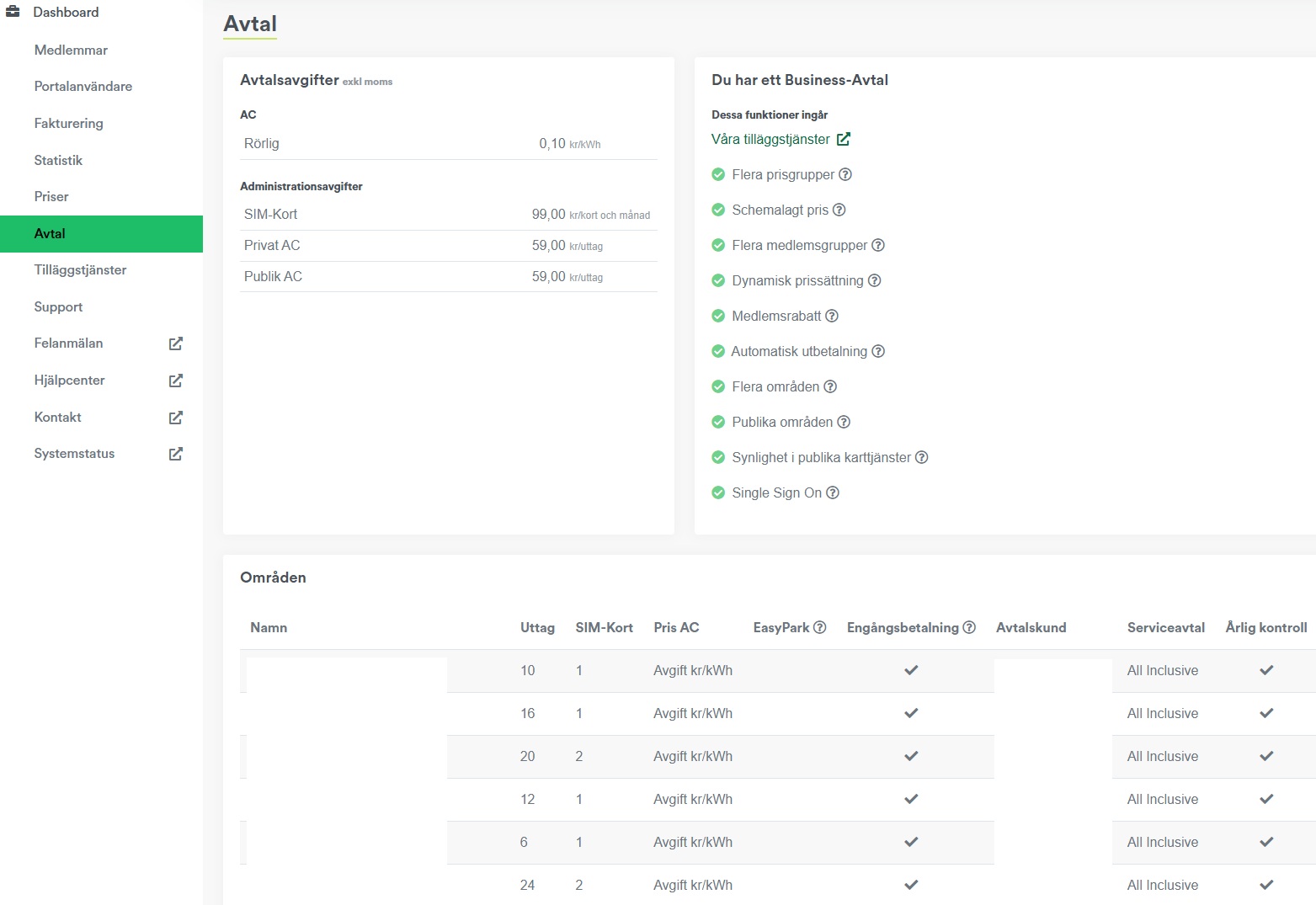 Laddtjänstavtal Business: Här syns vad som ingår i avtalet, vilka funktioner som är aktiverade samt tillhörande kostnader.