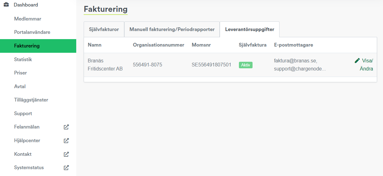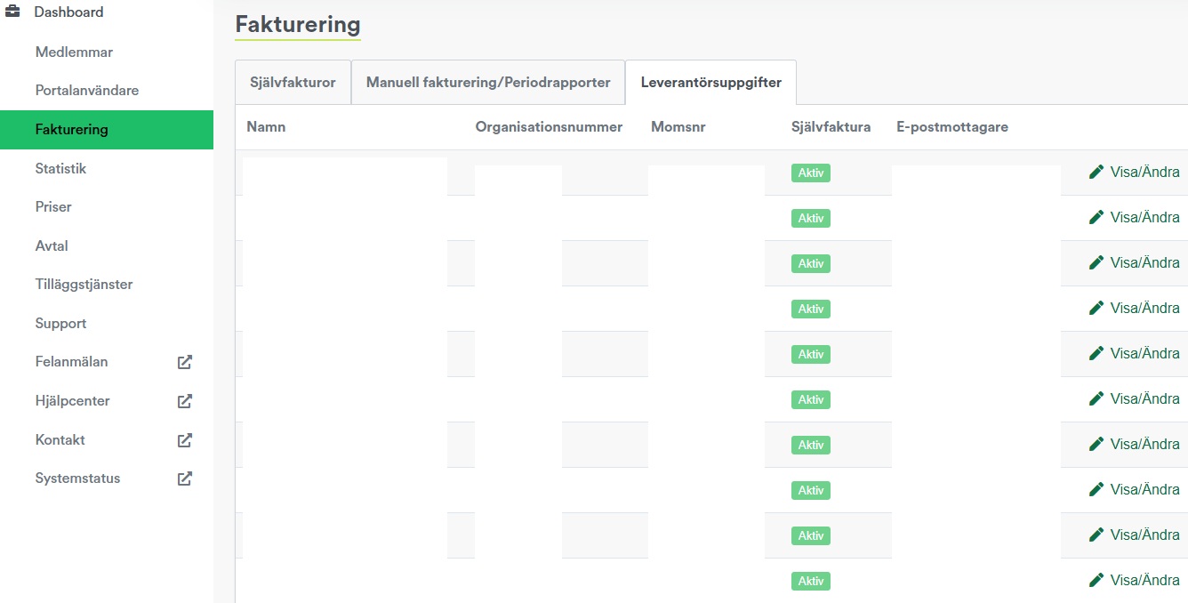 Via "Leverantörsuppgifter" finns en översikt över samtliga avtalskunder, och här går det att redigera självfakturauppgifter till respektive avtalskund genom att klicka på "Visa/Ändra".