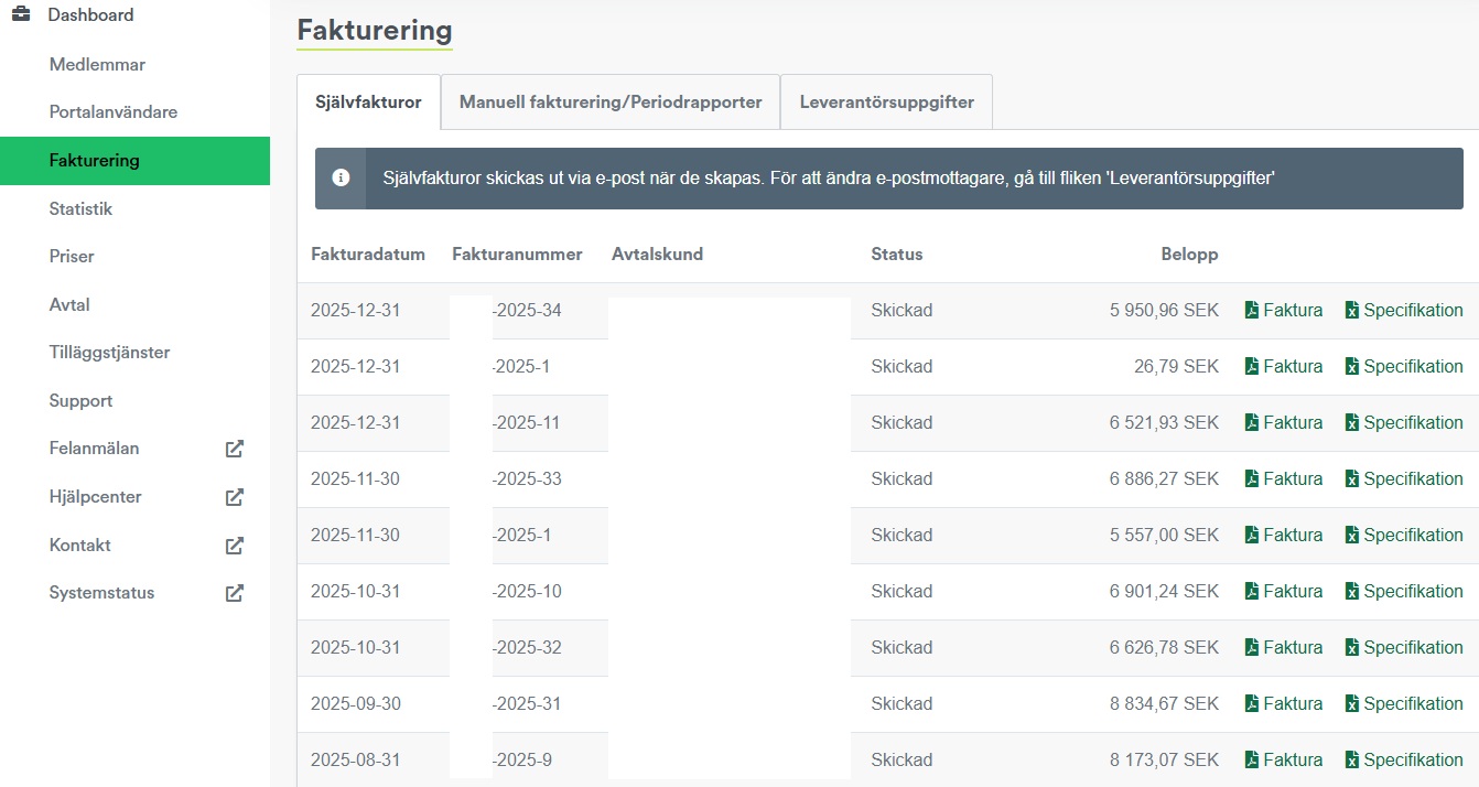 Under menyn "Fakturering" finns tillgång till självfakturor. Här visas fakturadatum, fakturanummer, avtalskund, status och belopp. Det går att ladda ned självfakturaunderlag som PDF för bokföring samt specifikationer som exporteras till en Excel-fil, där samtliga sessioner kopplade till fakturan framgår. Fakturerings- och adressuppgifter finns också tillgängliga och kan redigeras under "Konfigurera självfaktura".
