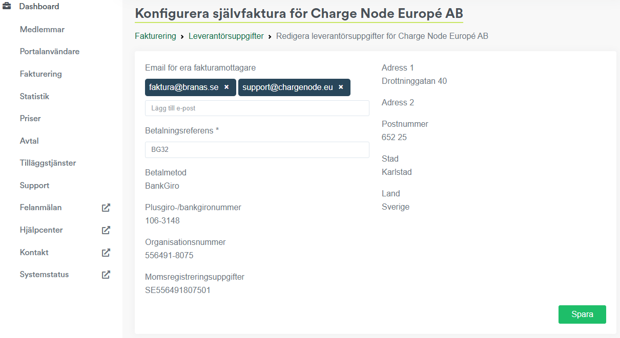 Under "Konfigurera självfaktura" går det att ändra fakturamottagare och betalningsreferens, och flera mottagare kan läggas till. För ändringar av övriga uppgifter, vänligen kontakta support@chargenode.eu.