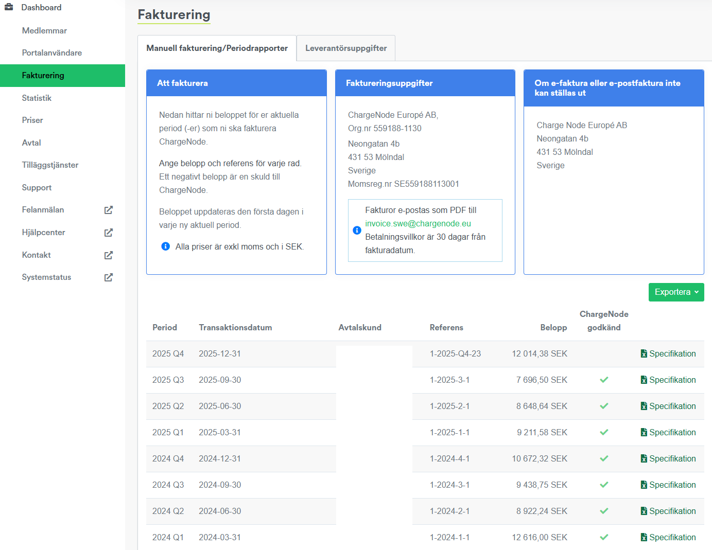 Vid manuell fakturering behöver ni själva gå in och se det aktuella beloppet för er period eller perioder som ska faktureras till ChargeNode för innestående laddintäkter. Beloppen uppdateras den första dagen i varje ny period.