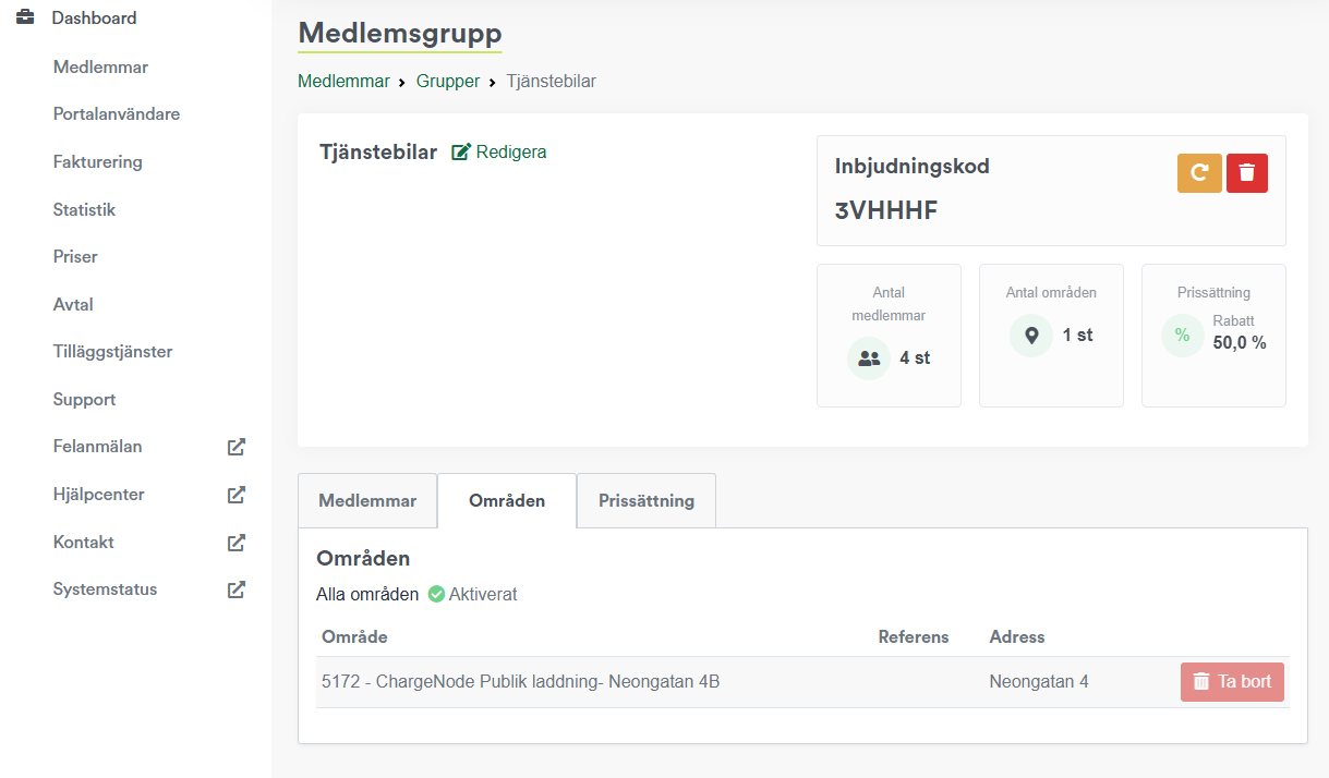 Medlemmar: På gruppens sida kan du se vilka medlemmar som tillhör gruppen, lägga till eller ta bort medlemmar och generera en inbjudningskod som användare kan ange i ChargeNode‑appen för att ansluta sig till gruppen. Koden kan bytas ut eller tas bort vid behov. Du får också en översikt över hur många områden gruppen har tillgång till samt vilken prisnivå som gäller. Det går även att redigera namnet på gruppen.