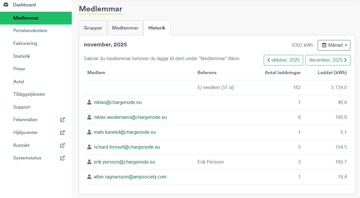Vyn presenterar hur många laddningar som gjorts av medlemmar/icke medlemmar och mängden kWh som laddats. Kan filtreras efter månad, kvartal och år.