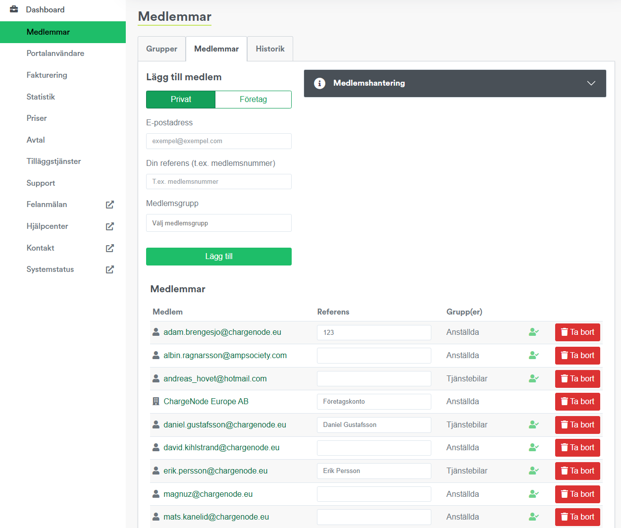 Här visas en översikt över samtliga medlemmar. Lägg till nya medlemmar genom att ange deras e-postadress, referens och därefter välja vilken grupp medlemmen ska tillhöra.
