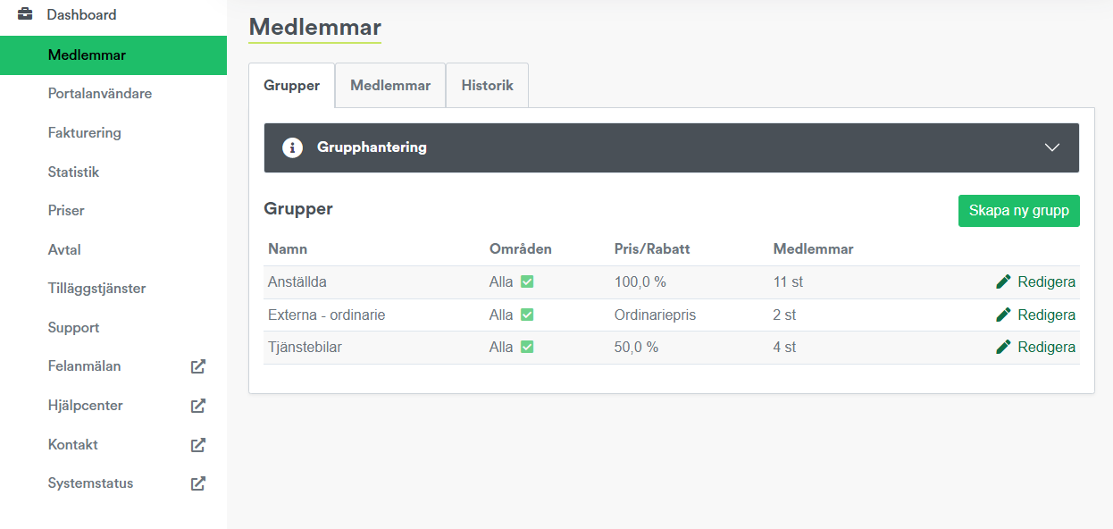 Här finns en översikt över alla medlemsgrupper. Det går att skapa nya grupper samt redigera befintliga. Genom att klicka på ”Redigera” kommer du in på den specifika medlemsgruppen.