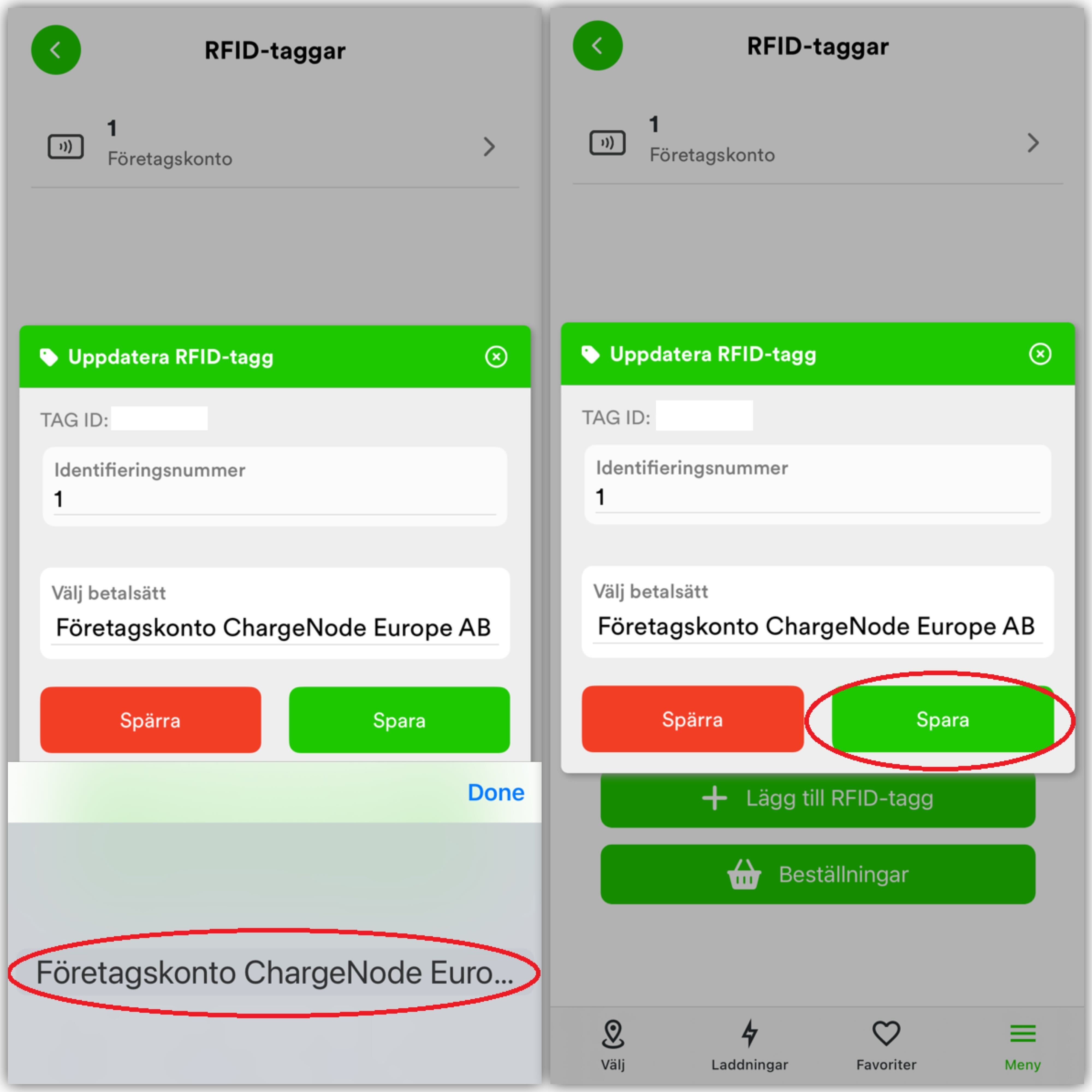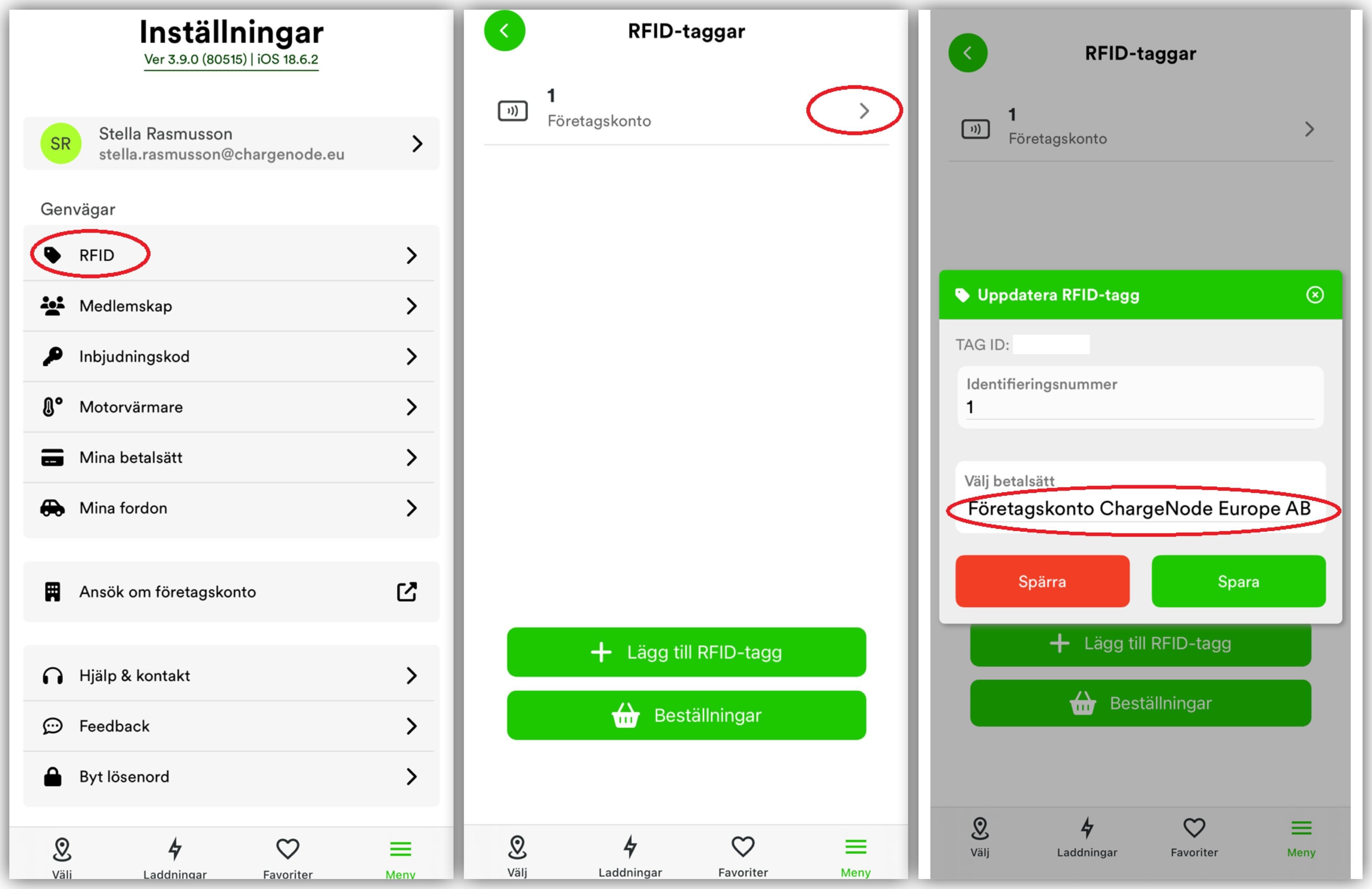 En användare kan även ha en egen RFID-tagg på sitt användarkonto som blir behörig för företagskontot, om e-postadressen är registrerad som medlem. Om användaren inte har något eget betalkort registrerat dras laddningen automatiskt från företagskontot. Om användaren har ett eget kort registrerat behöver man i appen under RFID välja vilken betalmetod som ska användas för taggen, antingen privat kort eller företagskonto. Se bilderna nedan (Inget eget betalkort är registrerat och därför finns endast företagskonto som betalalternativ).